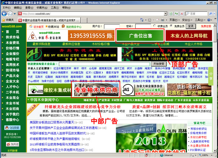 中國木業(yè)信息網(wǎng)首頁各種類型廣告尺寸及位置示范