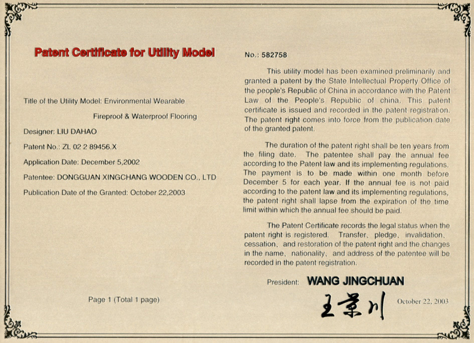 地板專利證書
