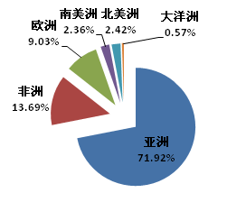 2019年,我國人造板設(shè)備類產(chǎn)品的進(jìn)出口總額為1.2億美元,較2018年增加5.62%, 其中出口額9460萬美元,比2018年增加3.26%;進(jìn)口額3018萬美元,比2018年增加13.78%。2019年出口主要面向亞洲、非洲和歐洲地區(qū),分別占比71.92%、13.69%和9.03%,其中,向非洲地區(qū)出口比2018年增加152.47%。在出口方面,歐洲特別是德國等依然是進(jìn)口的主要來源地,占比達(dá)99.72%。
