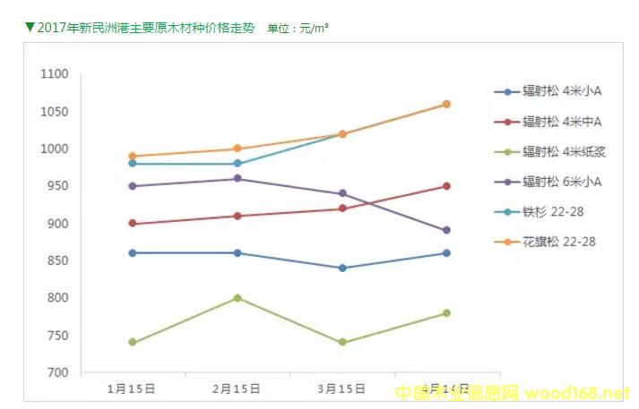 2017年新民洲港輻射松原木、鐵杉、花旗松價(jià)格走勢(shì)圖