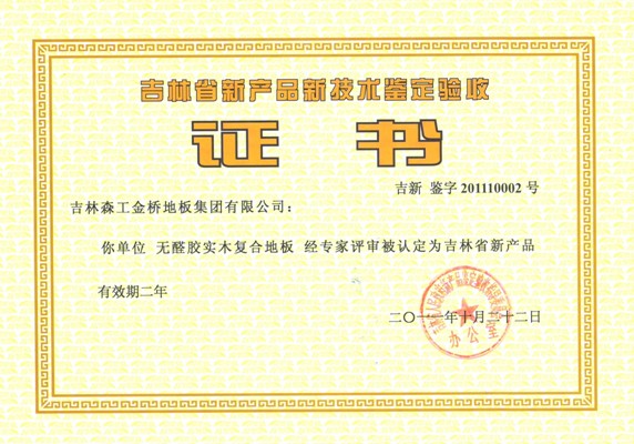 2011年10月22日,吉林省林業(yè)廳受工信廳的委托,組織專家對金橋地板集團(tuán)公司開發(fā)的“無醛膠實木復(fù)合地板”進(jìn)行了鑒定。吉林省人民政府新產(chǎn)品鑒定驗收指導(dǎo)委員會辦公室以吉新鑒字201110002號證書正式認(rèn)定金橋地板集團(tuán)開發(fā)生產(chǎn)的“無醛膠實木復(fù)合地板”為吉林省新產(chǎn)品。該產(chǎn)品使用水性異氰酸酯無醛膠粘劑,通過采用預(yù)熱涂膠、二次冷壓膠合的先進(jìn)工藝,徹底解決了實木復(fù)合地板甲醛釋放的問題,甲醛釋放量≤0.3毫克/升(相當(dāng)于天然木材含甲醛量),達(dá)到了綠色環(huán)保要求,迎合了國內(nèi)外健康環(huán)保的家居消費趨勢,對于開發(fā)國際國內(nèi)市場將起到巨大的推進(jìn)作用。吉林森工金橋地板集團(tuán)已成為國內(nèi)首家可以大規(guī)模生產(chǎn)無醛膠地板的企業(yè)。 “吉林森工金橋地板集團(tuán)無醛膠實木復(fù)合地板技術(shù)研究”被吉林省科學(xué)技術(shù)廳確認(rèn)登記為吉林省科技成果(證書編號2011365)。